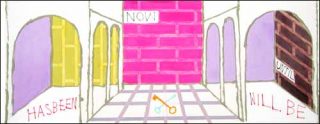 La problématique temporelle du titre de l’exposition « Maintenant Avant Après » apparaît explicitement dans l’œuvre intitulée Trois pièces où sont inscrits les mots « Has Been », « Now » et « Will Be ». La succession temporelle est convertie en succession spatiale : trois temps, trois pièces. Dans Réflexion sur la vie occidentale: le maintenant de l’espace de la toile paraît situé entre l’avant du paysage vu dans un rétroviseur d’automobile et l’après du paysage vu au travers du pare-brise.