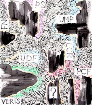 — Dérive continentale, 2003. Peinture, encre, collage sur toile. 150 x 200 cm environ.