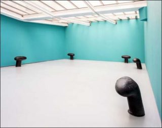 «Maintenant, j’habite près de la mer» fait référence au nouveau positionnement géographique de l’artiste, à cette nouvelle proximité avec l’imaginaire maritime dont il a moulé des éléments génériques, des bittes d’amarrage. Celles-ci évoquent la stabilité et l’ancrage, comme la zone liminale entre espace liquide et solide, mouvement et stagnation. Disposés à proximité des murs de la galerie, les moulages viennent créer un marquage, sorte de balises délimitant un vide central de l’espace de la galerie transformée en hypothétique quai imaginaire, pour interroger le mur comme une limite illusionniste: écran devant lequel une attente becketienne semble prendre corps chez le spectateur. Leur forme abstraite, massive, et répétitive, évoque des objets à la fois informes et standardisés, spécifiques et triviaux, en même temps qu’ils disposent d’une autonomie esthétique, une apparence de poids et de densité qui les relie au champ de la sculpture. Contrairement aux chaises en plastiques moulées dont l’artiste a fait sa signature, ces éléments ont perdu leur ustensilité dans la traduction du moulage qui leur a fait perdre leur poids.