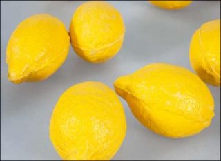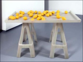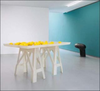 Initialement, ces objets servent à amarrer ces mêmes cargos dont on peut imaginer qu’ils importent les cargaisons d’objets en séries que l’artiste a répliqué durant toute sa carrière. Des cargaisons de contrebande aussi, commerce d’art et d’armes («La beauté des canons»), piratage (la contrefaçon, le faux, le double), étant des récurrences dans l’Å“uvre d’Etienne Bossut. Une référence qui pourrait être ici appuyée par le bleu du revêtement d’un mur tiré de la couleur du pull de Tintin sur la couverture de Coke en stock (Hergé). A moins qu’il ne s’agisse de chargements de produits «exotiques», comme ces citrons posés, en prologue de l’exposition, en presque lévitation sur des tréteaux moulés. Leur étalage, neutralisé dans une couleur translucide, accentue les espaces entre les fruits en même temps qu’il anéanti le principe logique d’unité: l’idée d’un fond sur lequel les objets/figures sont ancrés.