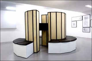 Au centre de l’espace d’exposition de la Galerie Jousse entreprise se trouve une sculpture d’aspect minimale. Le reste de l’installation s’organise autour d’elle. Elle est composée de deux parties semi-circulaires reliées par une poutre. Chacun des deux éléments est formé d’une banquette où le visiteur peut s’asseoir et d’une structure verticale qui fait office de dossier.