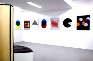 De l’autre côté du module : une série de peintures de géométrie abstraite. D’un aspect très graphique, elles renvoient toutefois aux classiques du genre, à Albers par exemple. Cette fois, Julien Prévieux se réapproprie les formes décoratives utilisées sur les couvertures de livres de sciences économiques des années soixante-dix et quatre-vingt. Elles sont isolées sur une toile et doublées d’une légende, d’un slogan, comme on nomme un graphique ou un tableau statistique. Il interroge ainsi la manière dont les formes produisent des références inconscientes.