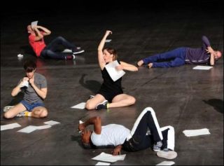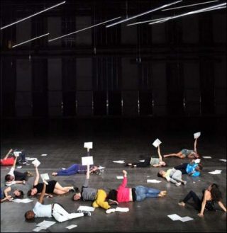 «Pièce d’envergure assurément, dans la lignée des précédentes, cette nouvelle création réunit quatorze interprètes. Entre la performance, individuelle et collective, et l’installation plastique, manger met les pieds dans le plat. «La question de la nourriture, du régime alimentaire, est constitutive de l’identité du danseur, de la façon dont il se façonne, dont il se prépare pour danser.» Boris Charmatz veut donner à voir ce qui travaille les corps et ce qui agit, alors, la danse. Écartons toute ambiguïté : Manger ce n’est pas La Grande Bouffe de Ferreri. Pas de noces pantagruéliques ici. Des feuilles de papier jonchent le sol, parsèment le plateau qui fourmille de présences. Elles seront aspirées, mâchouillées, broyées, avalées, régurgitées… Pages blanches sur lesquelles vient s’imprimer la trace des corps. Ce transit incessant produit un chant intérieur. S’ils incorporent, ils ex-corporent en sons, qui deviennent mélopée, et donnent la mesure de ces transformations. Les corps sont caisses de résonance de ces métamorphoses. Manger nous projette dans ces dérèglements progressifs et en cascades, au plus près de ce qui s’échange et change les corps, les couche au sol. «Les quatorze interprètes se remplissent à la fois des mouvements, de la nourriture, et d’une oralité, de paroles, de sons, de chants. Ce qui m’intéresse est plus de l’ordre de l’invisibilité: mettre dans la bouche, ingurgiter, faire disparaître, c’est presque de la magie. J’interroge un processus, non de méditation, mais de concentration sur ce qui se passe à l’intérieur de la danse et des organismes, quelque chose qui relève plutôt du body art au sens où on transforme le corps de l’intérieur.» À ce régime-là , le spectateur est pris aux tripes. Pourtant cette dégradation d’anatomies réduites à une mécanique physiologique, ces quasi-mutations, ne marquent aucun irrespect des corps. Plutôt la violence qui leur est faite. Manger s’inscrit entre ingérer, fait individuel, et consommer, fait social. «Cet acte relève d’un rapport au réel. On croit manger des chips devant la télé, mais en fait on est en train de digérer les nouvelles du monde. Et la danse a quelque chose à faire avec ce rapport d’incorporation, cette question de ce qui entre dans notre corps de gré ou de force, et nous construit » Âme et chair. Le plasticien Michel Journiac, figure emblématique de l’art corporel en France, n’a-t-il pas écrit que: «La société nous fabrique un corps»? — Raymond Paulet.