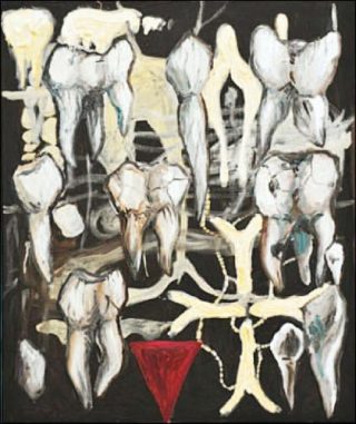 Au fur et à mesure que l’on avance dans l’exposition, on est soumis à un changement d’atmosphère plutôt brutal. Fœtus et dents blanchâtres peuplent une série de toiles libres et de dessins accrochés aux murs, à l’univers cauchemardesque. Cette série contraste radicalement avec l’humour et les couleurs criardes qui se dégagent des œuvres les plus récentes.