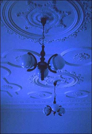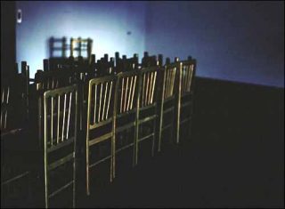 Un cliché montre une rangée de chaises dorées surgissant dans l’espace en formant une forte oblique, la lumière rasante qui se pose sur les barreaux des dossiers fabrique des verticales qui allument l’image comme autant de petits néons dont le jaune vient complémenter le bleuté du fond de salle.