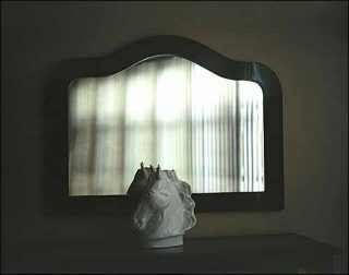 Dégageant un grand silence générateur de gravité, évitant les indices temporels, les photographies semblent se centrer sur la présence des choses et leur expressivité dans les tensions qui se dissimulent à un regard flottant. Celle d’une tête de cheval dont la fougue est figée dans la céramique par exemple, alors qu’au dessus d’elle, entre ombre et clarté, la nargue un miroir où le reflet en personnage central, laisse apparaître un flou comparable à ceux des fenêtres des trains qui par leur trop grande vitesse nous empêchent de distinguer le paysage extérieur.