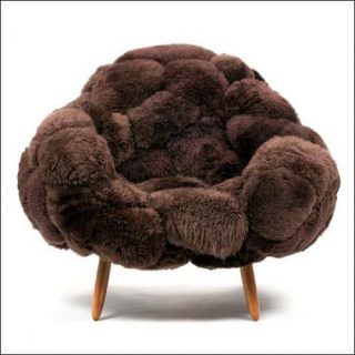 Ofidia, le mot portugais pour serpent, est une série inspirée par les ondulations sinueuses du reptile qui se déplace. Constituée d’une table de chevet et d’un miroir, la série réalisée en bronze coulé prend l’aspect d’un long morceau de corde qui glisse et se tord de manière organique et dynamique. La collection Bolotas, déclinée en un fauteuil et un canapé, est toute entière dédiée au confort. Le duo de designers a utilisé du bois brésilien naturel pour réaliser les pieds et de la peau de mouton pour les coussins.