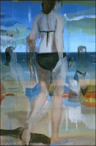 Marc Desgrandchamps fait pareillement des eaux calmes de la plage un motif mythique où, par-delà la baigneuse de Sans titre (2008), il faut regarder les baigneurs qui ne sont presque rien d’autre qu’une famille à la mer, presque rien de plus que des naufragés. Là se tient et vers là -bas marche, est-il inscrit au bas de la toile, «la Gradiva au dernier rivage».