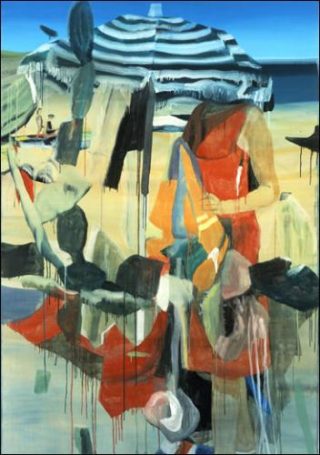 Rien de moins vide cependant que ces compositions pleines de visages qui semblent, lorsqu’ils ne sont pas effacés, un peu raides toujours grecs, surmontant des corps exécutés avec une insensible maladresse, presque une gaucherie de proportions, compositions décomposées à la facture un peu grossière, aux tons parfois rebutants. Mais c’est que leurs motifs incitent aux repoussements: plages azurées parcourues de passants en tongs, barques couchées et mouettes en vol; les espaces infinis touristifiés.