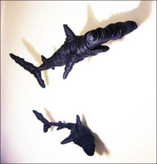 L’artiste présente ainsi une grande pieuvre noire dont les tentacules ondulants se déploient dans la quasi-totalité de l’espace. La texture particulière de la sculpture reproduit parfaitement l’impression de flottement de la matière. A la fois dense et légère, l’œuvre semble réellement suspendue entre deux eaux, comme si la large vitrine de la galerie renfermait un aquarium géant.