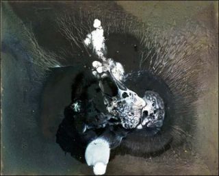 Il y a des nuées vivantes, des têtes, des yeux, coulés par peinture. Faune, flore de peinture. La vie se coule, se raffine, se précipite, se parfait, dans la matière déversée. La peinture de Lionel Sabatté est pictomorphique. Elle se déverse sur la toile comme un coup de dé, matérialisant la loi du hasard objectif, fait des rencontres d’une causalité matérielle indéterminée et d’une force de figuration donnant substance au fortuit. Ce travail s’effectue dans un cadre d’horizon d’attente très ouvert pour se réapproprier le matériau formel fourni par la peinture coulée et déversée au départ. Dans cette réappropriation se joue l’enjeu d’un dépaysement systématique qui passe par un approfondissement et un élargissement de la perception esthétique. Car, se faisant, la peinture maîtresse et maîtrisée, admet le désordre et le comprend, le transformant en éléments atmosphériques. Comme un pied de nez à l’entropie, la peinture, créant un champ de séduction et d’attraction, consume le hasard.