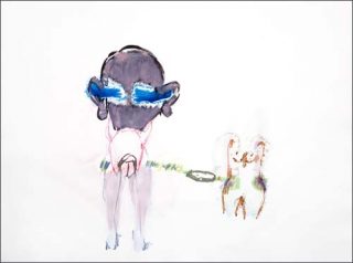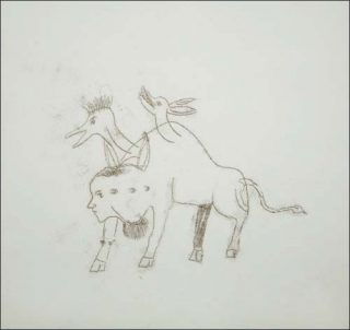 Dans la série des « dessins aveugles » apparaissent des corps d’enfants et des petits monstres dont les expressions sont souvent jubilatoires. Leur procédé repose sur le dessin réalisé à l’aide d’une pointe sur du papier carbone. C’est donc une sorte de dessin à l’aveugle, au trait froissé, que l’artiste réalise, car tout au long de son exécution le dessin reste caché par la feuille noire en surface. Mais ils ne sont aveugles que dans leur processus puisqu’ils nous donnent à voir l’imaginaire fantaisiste teinté de notes enfantines de l’artiste.
