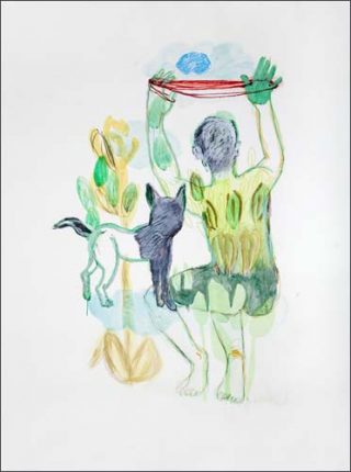 Certains de ses tableaux font penser à des rébus. Comme celui-ci, exposé à la galerie Eric Dupont, où flottent sur le fond blanc une espèce de graine germée avec à ses côtés une forme d’utérus gris aux larges oreilles, une patte griffue et une bouche aux dents pointues. Ces éléments font penser à des symboles, à des abstractions. Serait-ce une histoire étrange que l’artiste veut nous conter ? En tous cas, le champ de l’interprétation est libre, aucun titre ne vient ébaucher une piste particulière.