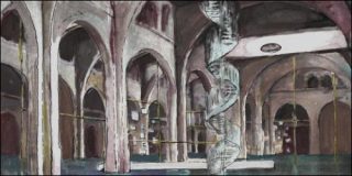 Des grandes tentures éteignent l’architecture, une double projection en miroir du film Orient tourne en boucle et se regarde depuis un gigantesque banc triangulaire qui coupe la nef en quatre. Un faux plafond perforé laisse descendre une lumière violacée alors qu’un personnage sur un plongeoir suspendu vibre au gré des variations de lumière.