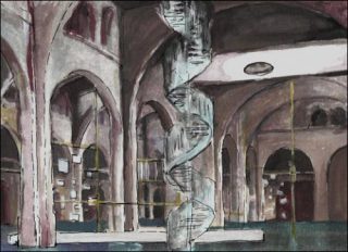 La nef du CAPC est plongée dans l’obscurité. Une gigantesque structure tubulaire en laiton traverse l’espace. Des ciels peints et des portraits retouchés suspendus à des fils métalliques sont comme lancés dans le vide. Les cimaises sont couvertes de Brinjal. Des culbutos jouent aux échecs et des marionnettes d’enfants claquent des fers sur le sol. Un escalier Eiffel en colimaçon relie le sol au plafond, il fait treize mètres de haut.