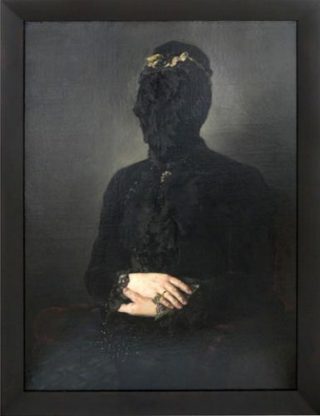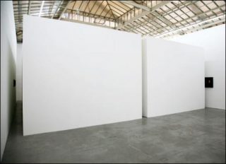 L’énorme mur blanc qui obstrue l’espace de la galerie, se révèle finalement comme étant un énorme bloc tridimensionnel, véritable objet sculptural. D’une grande radicalité formelle, placé au centre de l’espace, ce parallélépipède laisse courir de longs couloirs étroits entre lui et les murs de la galerie. Le long de ces couloirs impossibles à emprunter, sont accrochées des toiles de l’artiste, mais seules peu d’entres restent clairement visibles. Ces toiles font partie d’une série de portraits de maîtres du XIXe siècle, que l’artiste a retouché en intervenant sur le visage, en y ajoutant des masques ou des prothèses au niveau de la bouche, des yeux, sans que le personnage ne semble en souffrir.