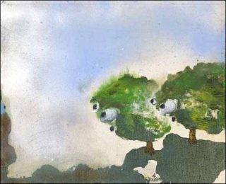 Tout un monde aux formes diffuses et éphémères (geysers, fumées, nuages, etc.) surgit des toiles comme par génération spontanée. Des monstres, des spectres, des animaux fantastiques et des personnages viennent, d’un tableau à l’autre, baigner l’exposition dans une atmosphère étrange et envoûtante.