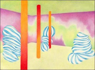 Traités avec des détails ornementaux chargés, les édifices représentés sont parfois comme prisonniers d’une végétation tropicale luxuriante et de ciels lourds de couleurs. D’autres fois, au contraire, les images se composent d’éléments colorés dépouillés jouant seulement sur l’équilibre des rapports volumétriques. Mais que ce soit des intérieurs domestiques ou des vues extérieures, tous sont hantés par l’absence de figure humaine, donnant aux environnements un statut de décor ou bien encore de scène d’anticipation.
