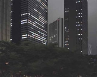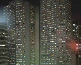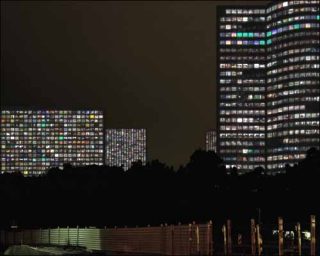 Mathieu Bernard-Reymond. Je voulais confronter deux visions différentes, la mienne et celle de la ville. J’avais envie des visions intérieures avec des paysages urbains nocturnes. L’idée était d’opposer cette réalité scintillante, constituée de fenêtres éclairées, à une vision plus personnelle. Je voulais comprendre comment les images télévisuelles s’immiscent dans le monde réel. Sur les façades des immeubles, chaque carré de lumière représente un poste allumé. Par ricochet il est associé à un téléspectateur, à une personne regardant le petit écrans. En peinture, la fenêtre est associée à l’ouverture. De nos jours cette perspective passe par le biais de la télé.