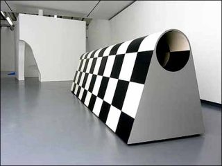 Il présente dans l’espace de la galerie Chez Valentin plusieurs objets combinant ces différentes sections artistiques. La première œuvre visible est un tube dont la perspective est renforcée par un motif en damier: ccomme une figure complexe de géométrie, elle semble posée là comme une énigme.