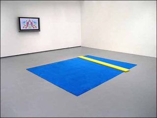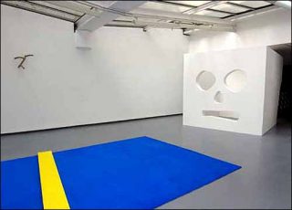 Devant le cube, au sol, une planche jaune posée de biais sur une moquette carrée bleue reprend la référence à la sculpture minimale d’un Carl Andre, et en détourne la rigueur et la sobriété par ses couleurs acides. Au mur, une autre sculpture, entre perchoir pour oiseau et béquille, laisse libre cours à l’interprétation.