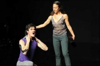 Mathilde Monnier. Oui, c’est une pièce sur le temps qui s’arrête. La pièce commence par la fin. Dés le départ, les danseurs meurent en tombant sur le sol. Puis elle ne cesse de courir après un mouvement qui ne veut pas s’arrêter. C’est une pièce qui est bloquée sur la question du temps : la construction séquencée par des boucles répétitives, les tempos court et unique de trois minutes pour chaque solo, l’heure qui s’affiche sur une horloge pendant le spectacle, l’injonction des sonneries qui appellent les danseurs sur scène pour mourir dans une chute….Ce n’est pas une construction en continuité, au contraire, c’est une pièce en rupture qui cherche la continuité.