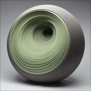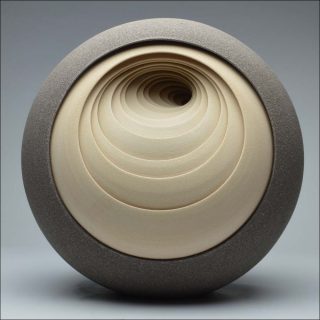 Matthew Chambers travaille essentiellement le grès qu’il façonne au tour de potier. Il tourne ainsi plusieurs sections qu’il assemble ensuite pour former un objet, une sculpture abstraite à la frontière entre objet d’art et pièce de design. Fortement influencé par les mouvements liés au constructivisme, le céramiste considère l’art comme un champ d’expérimentation. Lorsqu’il crée, il se laisse toujours guider par le procédé de fabrication, par le mouvement de la terre sur son tour de potier. A la fois concaves et convexes, les sculptures présentées à la galerie Mouvements Modernes ménagent des points de fuite inattendus. Véritables trompe-l’œil, elles donnent l’impression d’être animées; on y détecterait presque le mouvement d’une pupille à l’intérieur de son orbite. Concernant les couleurs, Matthew Chambers privilégie les tons neutres- les bleus, les verts et les oranges pâles- ou naturels, à l’instar des beiges, des marrons et des rouges.