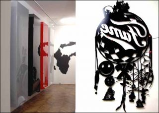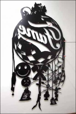 — Sans titre, Vanityfamesmileysadley mercedesjunk jordanmagictree, 2006. Découpe jet d’eau haute pression sur aluminium, peinture epoxy cuite au four. 245 x 125 cm.