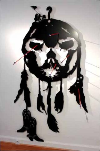 L’homme est resté égal à lui-même. En plus subtil. En quelques œuvres, le plasticien raconte une certaine géographie du monde, «américanocentrée». Les «Dreamcatchers» se font planisphères, étalant le drapeau états-unien, ou jouent avec leurs vides en leur donnant les contours des USA. Face à ces bribes géopolitiques, trois chefs indiens, de profil, plumes au vent, se découpent dans une lumière asthmatique. Un halo nimbe les fines appliques avant de s’éteindre dans un long silence.
