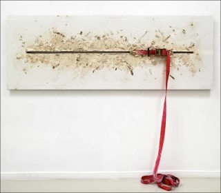 La force créatrice devient chez Florian Pugnaire une force de travail qui exploite les spécificités du matériau (sa résistance, sa souplesse, ou sa délicatesse) par le biais d’instruments mécaniques tels que des sangles, des palans, des treuils et des vérins hydrauliques. Dans l’œuvre Nœud, drapé, drapeau, c’est la malléabilité du plomb qui est utilisée. Alignées sur un mur, des plaques de plomb ont été pliées à divers degré. La première, entièrement compactée, ne forme plus qu’une boule de taille réduite tandis que la dernière à l’allure d’un drapeau à peine froissé. L’atelier devient ainsi le lieu d’un affrontement entre ses capacités physiques et celles des éléments. Il en ressort des œuvres dynamiques, souvent tourmentées voire visuellement violentes dont le processus de création l’emporte sur l’objet final.