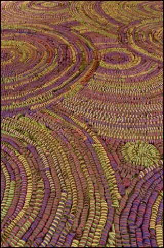 Dans le foyer, ouvert pour l’occasion, une curieuse installation : au sol des motifs imbriqués, faits de serpentins de papier, qui évoquent des tabourets chinois en rotin tressé.
