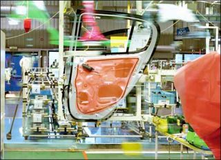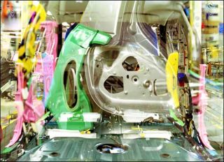 La spécificité de cette série tient aussi à la fluidité des formes qui laissent leur empreinte sur l’image. Choisissant des temps de pose longs, il fixe la forme fluctuante dessinée par les mouvements des robots, des ouvriers ou des tables de montage. D’une image «solide», il passe à une image «liquide», instable. Ainsi, il fait éclater la forme et dynamise la composition. On sent le mouvement, la vie, le scintillement des carrosseries neuves, le dynamisme de l’électricité qui anime les tables de montage.