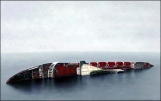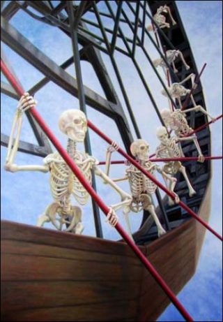 Le monde de Audrey Nervi, peuplé de créatures dont la vulnérabilité et la différence radicale tremblent comme une idée force, fuse alors sans entraves. Sur l’huile sur toile La roue tourne, des squelettes rament de concert sur une galère qui se déploie comme une grande roue. Dans la série Horizon, un bateau pirate se penche sur une ligne presque docile, comme s’il ne demandait que cela, sombrer à jamais sur une mer dont la couleur bleutée nous aimante. Sur la toile Fake King Rumania, c’est un lion sur son flanc qui, un club et une balle de golf abandonnés sur le dos, ne rugit pas sa vengeance à venir mais réclame simplement l’abandon.