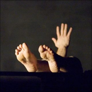 Une table, des tréteaux, une housse de contrebasse, des machines électroniques, des objets non identifiés, des projecteurs sont éparpillés au sol. De cet état de fin du monde, ou de début de quelque chose, des lumières lancinantes, pulsations prenantes, lancent les naissances insolites des corps, soit des créatures sorties du néant de l’objet. Métaphormose(s), un duo tendu et intense entre un musicien et un danseur, ne lésine pas sur l’effet de surprise, les passages inquiétants, qui peuvent être comiques par leurs étrangetés; des images fortes, toujours, où la monstruosité la dispute à la beauté. D’un côté Camille Perrin, le contrebassiste, physionomie et voix impressionnantes, incarne le côté brut, sauvage, presque dominant du duo, et règne, un rien monstre, sur le plateau. Il organise le dispositif scénique, les lumières, lance une bande son, redistribue l’espace à grands pas, déplace l’autre, l’observe. L’autre, c’est Nicolas Hubert, le danseur. Tout en retenue, et souplesse, bandé, blessé, moignon en bout de bras, il évolue au sol comme s’il était une créature encore prisonnière de sa chrysalide. Découvrant l’usage du corps, de ses muscles, il semble l’objet d’une expérience, contraint par les décisions de l’expérimentateur fou. Pourtant, dans un ring réalisé avec une économie de moyens, comme toutes les scènes, ses membres répondent aux riffs et chant libre du contrebassiste, moments de créations intenses entre ces êtres à mi-chemin entre fantasmagorie et réalité. Si une inquiétante étrangeté plane de bout en bout de Métaphormose(s), spectacle visuel pétri d’images à la croisée du cinéma, graphisme ou de la peinture, le propos se dessine par touches, au fil des peaux abandonnées.