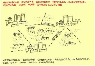 Comme cette dernière était construite sur un principe d’enjambement, à quelques dizaines de mètres du sol, la ville-continent est constituée par un ensemble de villes reliées entre elles par un réseau de transport rapide. Entre les mailles, le territoire reste libre pour l’agriculture et la sauvegarde de sites écologiques ou historiques.