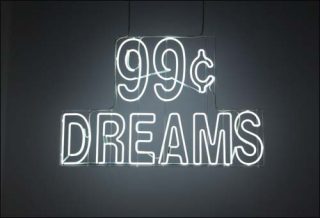 Dès la façade de la Maison Rouge, une œuvre de Doug Aitken: 99 Cents Dreams, inscrit en néon dans la vitrine, faisant référence aux enseignes des boutiques à prix unique qui livrent leurs rêves de pacotille.