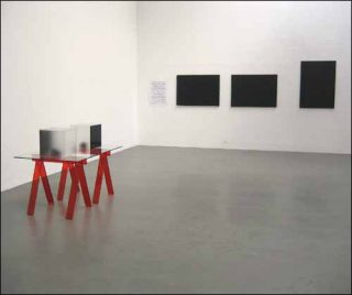 Car si «I Never Said Yes…» s’empare du processus photographique, c’est pour l’inverser. Contrairement à l’héliogravure — n’était-ce pas la dénomination si significative de Niepce? —, rien ne se fait dans le secret de la chambre noire. L’ombre et la lumière sortent de leur boite de Pandore pour s’emparer de la pièce. En son centre, une table — deux tréteaux en plexiglas grenadine surmontés d’un support en verre épais — présente une étrange composition géométrique: deux cubes blancs avec une face noire sont de part et d’autre d’un Minolta. A bonne distance, son objectif braqué sur le mur opposé, il traque la blancheur aveuglante qui vibre sous les rais de lumière.