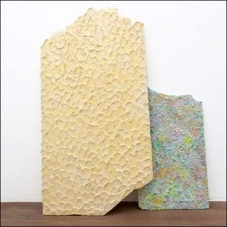 Des sculptures de la série des Textures ont la forme de plaques de résine moulée de fine épaisseur, aux bords irréguliers, peintes à la main, chacune avec une teinte et une texture différentes. Posées sur le sol et appuyées contre les murs, elles semblent avoir été arrachées de quelque part et laissées là à l’abandon, telles les restes d’un décor de cinéma. Ces plaques que l’on imagine provenir directement d’un plateau de tournage des vidéos de Mika Rottenberg sont comme un lien tactile et visuel qui unit l’ensemble de ses œuvres.