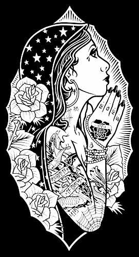 Les dessins, qui racontent des histoires, sont chargés de culture et d’humanité. Et, en tant que tatouages, ils portent les traces de traditions spirituelles ancestrales. Nombreux sont les attributs chrétiens (croix, vierges, etc.), ou les éléments funèbres, étranges et dérangeants. Mike Giant mêle l’horreur à la beauté de femmes fantastiques, la douceur à l’agressivité.