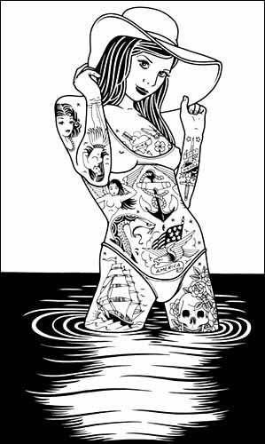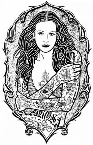 Les clichés de tatouages, qui sont généralement l’apanage des camionneurs ou des pin-up, sont traités par l’artiste de façon à dépasser leur apparente vulgarité. Non sans humour, il détourne ces images à la fois très érotiques et clairement esthétiques. Une ligne noire, dur et fine, souligne la sensualité du dessin et laisse toute sa place au sujet, aux formes pleines, et à l’esthétique rock’n roll.