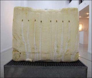 Dans cette installation, le savon produit de l’hygiène quotidienne, agit plus précisément en tant qu’agent de nettoyage dans le contexte de la gestion des eaux et fait écho aux préoccupations d’économies des ressources en eau. Sa caractéristique, dans sa représentation de produit polluant, est remplacée par une autre image. Son toucher et son odeur, éléments sensitifs dans le processus de cette sculpture, restituent le pouvoir de récupérer la vigueur, la mémoire et la symbolique du composant pour une utilisation raisonnée. Parallèlement, sa matière métaphorise le vivant et convoque dans une perspective Pongienne, l’idée d’une «toilette intellectuelle» (Francis Ponge, «Le Savon»).