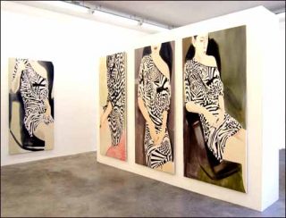 La dimension fascinante et vaine de la féminité se manifeste particulièrement dans la salle suivante, qui présente de vastes toiles sans profondeur. Toutes auscultent un corps de femme, le même, dans différentes postures. Le vêtement, qui répond aux stricts codes de la mode, demeure. Seule change la position du corps, toujours tronqué, qui rappelle volontiers les standards et le caractère répétitif de la photographie de mode. La première femme que Miltos Manetas met en scène incarne ainsi la superficialité de l’apparence.