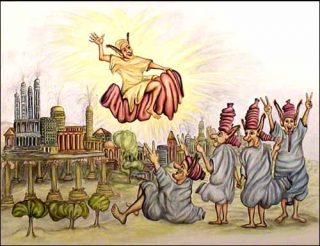 — Réussite antigravitationnelle avec l’« apparition » et sa conséquente commémoration, au pays des victorieux pluricultivés, 2005. Aquarelle sur papier. 113 x 144 cm.