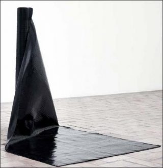 Anne-Charlotte Yver, connue pour ses modules en bétons, propose une installation in situ inédite. L’angle de la galerie, espace normalement dépouillé, devient ici lieu d’expérimentation sculpturale jouant avec la matérialité du béton. Dans une autre proposition minimale, l’artiste érige un tapis de goudron isolant enroulé pour être rangé comme un totem. Redressé du sol dans un dernier geste sculptural, il vient matérialiser la verticale et l’horizontale par la simple torsion naturelle de son corps.