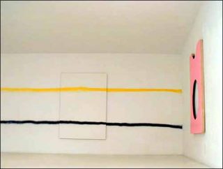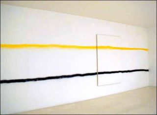 L’«intervention murale» Dessin-Peinture vient en contrepoint, et comme en négatif, de la série des «Pores». La peinture déborde littéralement de son cadre: l’important est ici le geste de l’artiste, ces deux lignes tracées à la bombe sur toute la largeur du mur, et qui marquent la toile comme par accident.