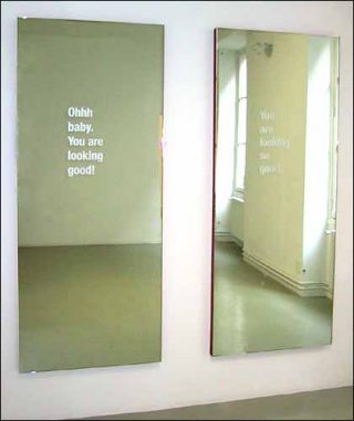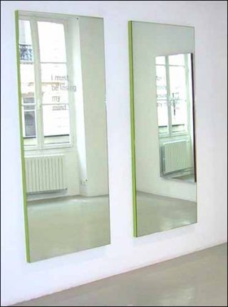 Au centre de chaque miroir est gravé un texte en lettres blanches. Les inscriptions fonctionnent par pair et respectent la répartition en deux volets. Le même texte est formulé différemment sur chaque pan du diptyque. On peut lire par exemple : « I must be losing my mind » (Je dois perdre la tête) et la même affirmation reprise sous forme de questionnement dans le miroir adjacent : « Am I really losing my mind ? » (Est-ce-que je perds vraiment la tête ?).