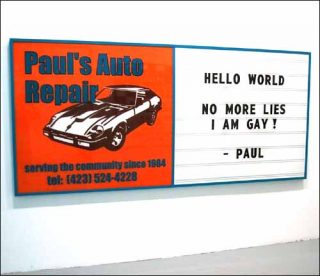 À travers Paul’s Auto Repair (Réparations automobiles Paul), l’en-tête promotionnelle : « Serving the Communauty since 1984 » (À votre service depuis 1984) est brutalement secondée par un aveu d’homosexualité de la part du garagiste : « Hello world, No more lies, I am gay ! Paul » (Écoutez tous, Finis les mensonges, Je suis gay ! Paul). Ce cri du cœur exclamatif, totalement libéré du poids des convenances, tranche ironiquement avec l’expression soumise et consensuelle : « À votre service depuis 1984 ». Il fait voler en éclats le carcan social des non-dits.