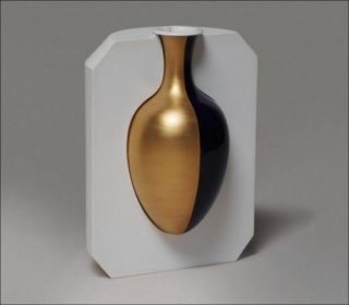 Modeler renvoie à l’image d’une pâte molle façonnée à la main, typique des terres cuites antiques mais que l’on retrouve aussi dans les Trois Modelages de Peter Briggs, ou la Workshop Chair de Jerszy Seymour dont les éléments de bois sont retenus ensemble par de la résine pâteuse. L’assemblage est utilisé pour rapporter des éléments comme les anses, ou créer des formes rectangulaires à angles vifs. L’Interactive Triptyque d’Arman, vase en porcelaine de Sèvres à large panse découvert pour l’occasion, est assez classique mais découpé en trois tranches retenues entre elles par des charnières et disposées comme un paravent… On peut encore comparer le Vase Bud des Sismo en verre thermoformé et collé dans un angle resté ouvert comme une brique de lait, avec une bouteille rectangulaire en porcelaine japonaise Arita datant du XVIIIe siècle.