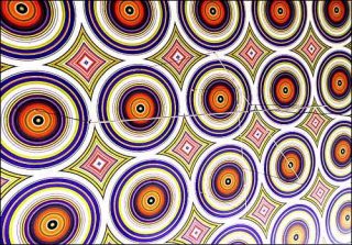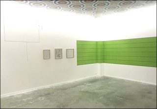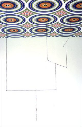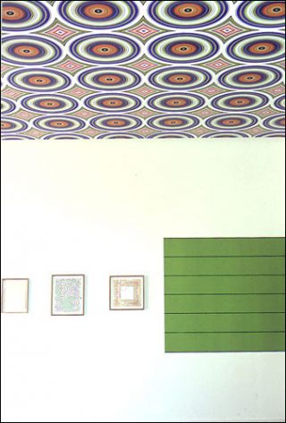 Stéphane Magnin a lui aussi utilisé les motifs abstraits pour concevoir un plafond en papier peint dont les couleurs composent d’une manière ludique un espace géométrique assez doux, un échange libre, visuel. Utilisant les matériaux de la société post-industrielle, Magnin montre ici très simplement, juste dans la répétition, comment derrière ces papiers peints réside l’obsessionnel, le désoeuvrement, l’indifférence que suscitent des décors quotidiens construits pour le plaisir domestique des classes moyennes.