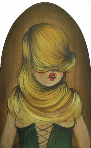 Arborant fièrement les attributs de la nature — elle semble s’avancer d’un pas ferme vers des régions mystérieuses où nous ne pouvons la suivre. Mais dans le même temps, ses yeux trempés de rimmel et du rouge à lèvre coulant sur ses joues, elle nous rappelle la position fragile qui est la sienne ; sans cesse menacée de se faire dévorer vivante par son public.